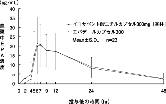 イコサペント酸エチルカプセル300mg「杏林」とエパデールカプセル300を、クロスオーバー法によりそれぞれ6カプセル(イコサペント酸エチルとして1,800mg注3))健康成人男子に単回経口投与して血漿中イコサペント酸濃度を測定し、得られた薬物動態パラメータ(AUC、Cmax)について統計解析を行った結果、両剤の生物学的同等性が確認された5)。なお、解析においては個人の食習慣の違いに由来する血中EPA濃度の違いを補正するために、投与後の各時期のEPA濃度から、投与前の濃度を引いた数値を用いて解析した。