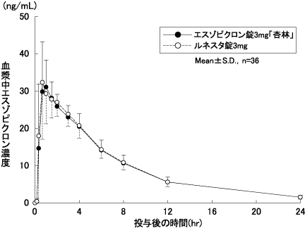 エスゾピクロン錠3mg「杏林」とルネスタ錠3mgをクロスオーバー法によりそれぞれ1錠(エスゾピクロンとして3mg)健康成人男子に絶食単回経口投与して血漿中未変化体濃度を測定し、得られた薬物動態パラメータ(AUC、Cmax)について90%信頼区間法にて統計解析を行った結果、log(0.80)~log(1.25)の範囲内であり、両剤の生物学的同等性が確認された2)。