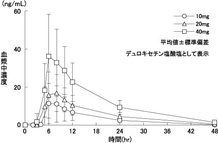 中等度の肝硬変を有する患者(Child-Pugh Bに分類)〔6例(男性5例、女性1例)〕と健康成人〔6例(男性5例、女性1例)〕との間でデュロキセチン20mg空腹時単回経口投与時の薬物動態を比較したとき、中等度の肝硬変を有する患者においては健康成人と比べてCmaxには有意な差は認められなかったが、AUCは約5倍に増大し、T1/2は約3倍に延長し、それぞれ有意差が認められた7)(外国人によるデータ)。,,