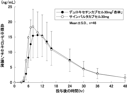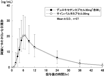 デュロキセチンカプセル20mg「杏林」は、「含量が異なる経口固形製剤の生物学的同等性試験ガイドライン」に基づき、デュロキセチンカプセル30mg「杏林」を標準製剤としたとき、溶出挙動に基づき、生物学的に同等とみなされた12)。