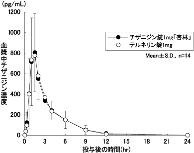 チザニジン錠1mg「杏林」とテルネリン錠1mgをクロスオーバー法によりそれぞれ3錠(チザニジンとして3mg)健康成人男子に絶食単回経口投与して血漿中未変化体濃度を測定し、得られた薬物動態パラメータ(AUC、Cmax)について統計解析を行った結果、両剤の生物学的同等性が確認された1)。