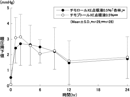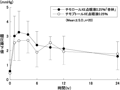 チモロールXE点眼液0.25%「杏林」とチモプトールXE点眼液0.25%を健康成人男子の両眼にそれぞれ1滴単回点眼し、眼圧値を測定した。各測定時点の眼圧値より得られたパラメータ(最大眼圧降下値、眼圧降下値-時間曲線下面積)について統計解析を行った結果、両剤の生物学的同等性が確認された18)。