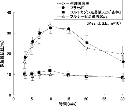 モルモットの実験的アレルギー性鼻炎モデルにおいて、鼻腔局所投与により抗原誘発鼻腔抵抗増加に対する抑制作用をプラセボ及びフルナーゼ点鼻液50μgと比較検討した。通気溢出量の上昇を鼻腔抵抗上昇反応として測定し、抗原誘発後30分までの鼻腔抵抗値を比較検討した。