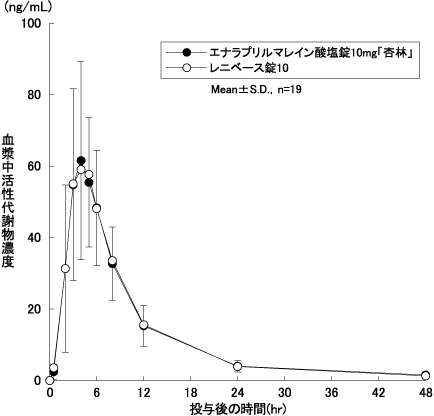 エナラプリルマレイン酸塩錠2.5mg「杏林」、エナラプリルマレイン酸塩錠5mg「杏林」又はエナラプリルマレイン酸塩錠10mg「杏林」とレニベース錠2.5、レニベース錠5又はレニベース錠10をクロスオーバー法によりそれぞれ4錠、2錠、1錠(エナラプリルマレイン酸塩として10mg)健康成人男子に絶食単回経口投与して血漿中活性代謝物(エナラプリラート)濃度を測定し、得られた薬物動態パラメータ(AUC、Cmax)について90%信頼区間法にて統計解析を行った結果、log(0.80)~log(1.25)の範囲内であり、両剤の生物学的同等性が確認された5)。