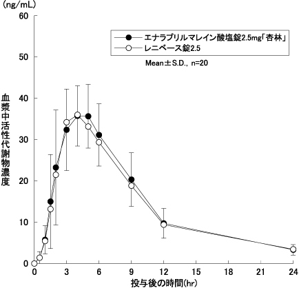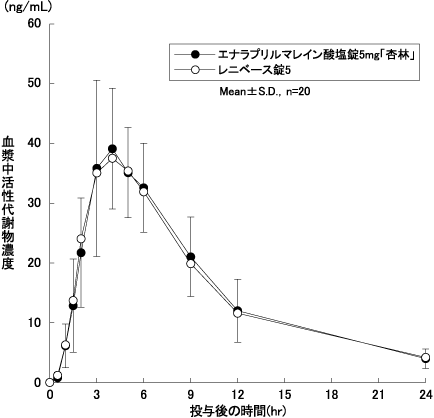 エナラプリルマレイン酸塩錠2.5mg「杏林」又はエナラプリルマレイン酸塩錠5mg「杏林」とレニベース錠2.5又はレニベース錠5をクロスオーバー法によりそれぞれ4錠、2錠(エナラプリルマレイン酸塩として10mg)健康成人男子に絶食単回経口投与して血漿中活性代謝物(エナラプリラート)濃度を測定し、得られた薬物動態パラメータ(AUC、Cmax)について90%信頼区間法にて統計解析を行った結果、log(0.80)~log(1.25)の範囲内であり、両剤の生物学的同等性が確認された5)。