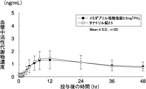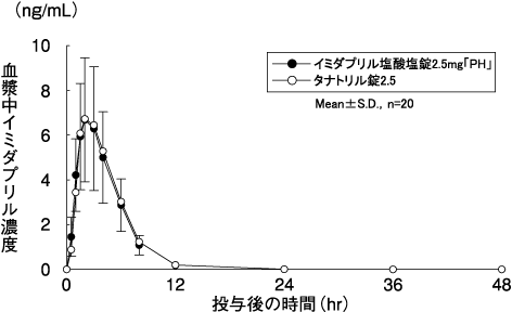 イミダプリル塩酸塩錠2.5mg「PH」とタナトリル錠2.5をクロスオーバー法によりそれぞれ1錠(イミダプリル塩酸塩として2.5mg)健康成人男子に絶食単回経口投与して血漿中活性代謝物(イミダプリラート)の濃度を測定したところ、投与後緩やかに上昇し、それぞれ12時間に1.327及び1.466ng/mLに達した後、緩やかに減少し、最終採血時点の48時間ではそれぞれ0.812及び0.731ng/mLを示した5)。