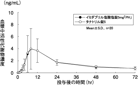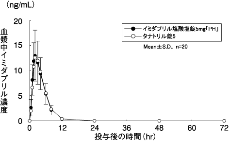 イミダプリル塩酸塩錠5mg「PH」とタナトリル錠5をクロスオーバー法によりそれぞれ1錠(イミダプリル塩酸塩として5mg)健康成人男子に絶食単回経口投与して血漿中活性代謝物(イミダプリラート)の濃度を測定したところ、それぞれ11.3及び11.9時間にCmax4.432及び4.394ng/mLに達した後、t1/242.04及び40.25時間で減少した5)。