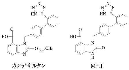 カンデサルタン シレキセチルはカルボキシルエステラーゼにより活性代謝物カンデサルタンに代謝され、さらに一部がCYP2C9により非活性代謝物M-Ⅱに代謝されるが、本態性高血圧症患者にカンデサルタン シレキセチルを投与したときのM-Ⅱの血中濃度及び尿中排泄率はカンデサルタンの血中濃度及び尿中排泄率に比べ低く、CYP2C9の遺伝的多型によるカンデサルタンの血中濃度への影響は少ないと考えられる5)。また、カンデサルタンはCYP1A1、1A2、2A6、2B6、2C8、2C9、2C19、2D6、2E1、3A4の代謝活性を阻害しない8)(in vitro)。