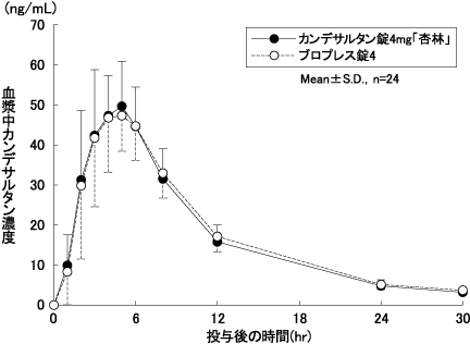 カンデサルタン錠4mg「杏林」とブロプレス錠4をクロスオーバー法によりそれぞれ1錠(カンデサルタン シレキセチルとして4mg)健康成人男子に絶食単回経口投与して血漿中カンデサルタン濃度を測定し、得られた薬物動態パラメータ(AUC、Cmax)について90%信頼区間法にて統計解析を行った結果、log(0.80)~log(1.25)の範囲内であり、両剤の生物学的同等性が確認された6)。