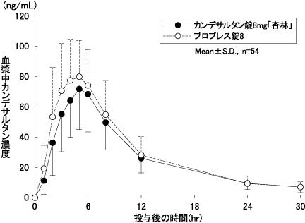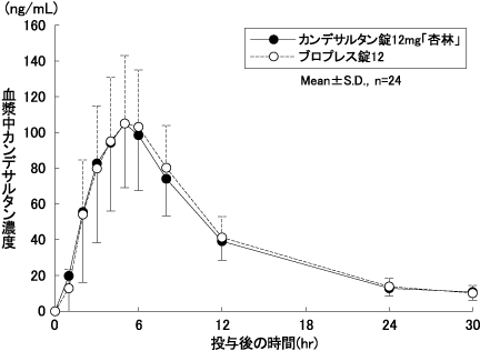 カンデサルタン錠12mg「杏林」とブロプレス錠12をクロスオーバー法によりそれぞれ1錠(カンデサルタン シレキセチルとして12mg)健康成人男子に絶食単回経口投与して血漿中カンデサルタン濃度を測定し、得られた薬物動態パラメータ(AUC、Cmax)について90%信頼区間法にて統計解析を行った結果、log(0.80)~log(1.25)の範囲内であり、両剤の生物学的同等性が確認された6)。