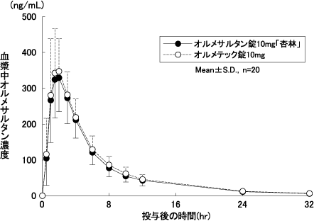 オルメサルタン錠10mg「杏林」とオルメテック錠10mgをクロスオーバー法によりそれぞれ1錠(オルメサルタン メドキソミルとして10mg)健康成人男子に絶食単回経口投与して血漿中活性代謝物(オルメサルタン)濃度を測定し、得られた薬物動態パラメータ(AUC、Cmax)について90%信頼区間法にて統計解析を行った結果、log(0.80)~log(1.25)の範囲内であり、両剤の生物学的同等性が確認された7)。