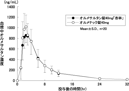 オルメサルタン錠40mg「杏林」とオルメテック錠40mgをクロスオーバー法によりそれぞれ1錠(オルメサルタン メドキソミルとして40mg)健康成人男子に絶食単回経口投与して血漿中活性代謝物(オルメサルタン)濃度を測定し、得られた薬物動態パラメータ(AUC、Cmax)について90%信頼区間法にて統計解析を行った結果、log(0.80)~log(1.25)の範囲内であり、両剤の生物学的同等性が確認された7)。