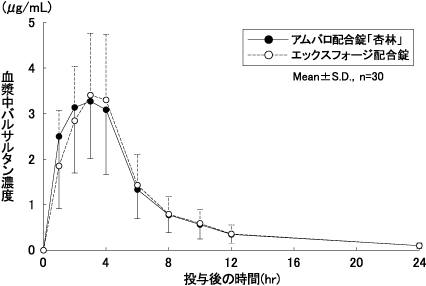 アムバロ配合錠「杏林」とエックスフォージ配合錠をクロスオーバー法によりそれぞれ1錠(配合錠:バルサルタン80mg、アムロジピン5mg含有)健康成人男子に絶食単回経口投与してバルサルタンの血漿中未変化体濃度を測定し、得られた薬物動態パラメータ(AUC、Cmax)について90%信頼区間法にて統計解析を行った結果、log(0.80)~log(1.25)の範囲内であり、両剤の生物学的同等性が確認された8)。