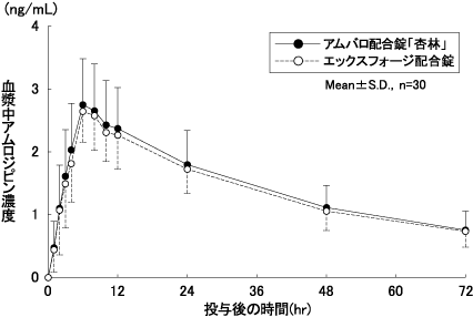 アムバロ配合錠「杏林」と標準製剤エックスフォージ配合錠をクロスオーバー法によりそれぞれ1錠(配合錠:バルサルタン80mg、アムロジピン5mg含有)健康成人男子に絶食単回経口投与してアムロジピンの血漿中未変化体濃度を測定し、得られた薬物動態パラメータ(AUC、Cmax)について90%信頼区間法にて統計解析を行った結果、log(0.80)~log(1.25)の範囲内であり、両剤の生物学的同等性が確認された8)。