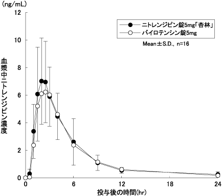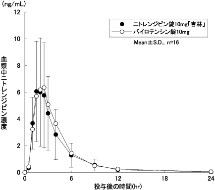 ニトレンジピン錠10mg「杏林」とバイロテンシン錠10mgを、クロスオーバー法によりそれぞれ1錠(ニトレンジピンとして10mg)健康成人男子に絶食単回経口投与して血漿中未変化体濃度を測定し、得られた薬物動態パラメータ(AUC、Cmax)について統計解析を行った結果、両剤の生物学的同等性が確認された3)。