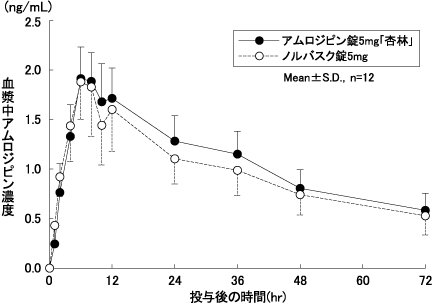 アムロジピン錠5mg「杏林」とノルバスク錠5mgをクロスオーバー法によりそれぞれ1錠(アムロジピンとして5mg)健康成人男子に絶食単回経口投与して血漿中未変化体濃度を測定し、得られた薬物動態パラメータ(AUC、Cmax)について90%信頼区間法にて統計解析を行った結果、log(0.80)~log(1.25)の範囲内であり、両剤の生物学的同等性が確認された8)。