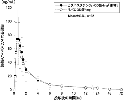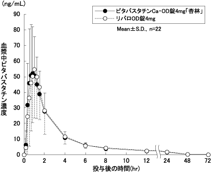 ピタバスタチンCa・OD錠4mg「杏林」とリバロOD錠4mgをクロスオーバー法によりそれぞれ1錠(ピタバスタチンカルシウムとして4mg)健康成人男子に絶食単回経口投与(水なしで服用及び水で服用)して血漿中未変化体濃度を測定し、得られた薬物動態パラメータ(AUC、Cmax)について90%信頼区間法にて統計解析を行った結果、log(0.80)〜log(1.25)の範囲内であり、両剤の生物学的同等性が確認された2)。