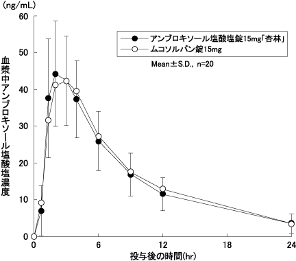 アンブロキソール塩酸塩錠15mg「杏林」とムコソルバン錠15mgを、クロスオーバー法によりそれぞれ2錠(アンブロキソール塩酸塩として30mg)健康成人男子に絶食単回経口投与して血漿中未変化体濃度を測定し、得られた薬物動態パラメータ(AUC、Cmax)について統計解析を行った結果、両剤の生物学的同等性が確認された1)。