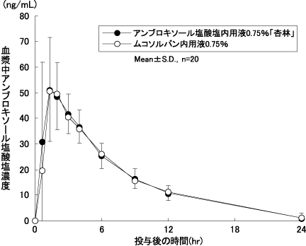 アンブロキソール塩酸塩内用液0.75%「杏林」とムコソルバン内用液0.75%を、クロスオーバー法によりそれぞれ4mL(アンブロキソール塩酸塩として30mg)を健康成人男子に絶食単回経口投与して血漿中未変化体濃度を測定し、得られた薬物動態パラメータ(AUC、Cmax)について統計解析を行った結果、両製剤の生物学的同等性が確認された1)。
