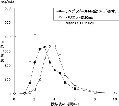 3) キョーリンリメディオ株式会社社内資料:ラベプラゾールNa錠20mg「杏林」の生物学的同等性試験に関する資料