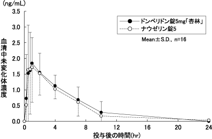 ドンペリドン錠5mg「杏林」とナウゼリン錠5をクロスオーバー法によりそれぞれ1錠(ドンペリドンとして5mg)健康成人男子に絶食単回経口投与して血清中未変化体濃度を測定し、得られた薬物動態パラメータ(AUC、Cmax)について95%信頼区間法にて統計解析を行った結果、±20%の範囲内であり、両剤の生物学的同等性が確認された1)。