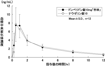 ドンペリドン錠10mg「杏林」とナウゼリン錠10をクロスオーバー法によりそれぞれ1錠(ドンペリドンとして10mg)健康成人男子に絶食単回経口投与して血漿中未変化体濃度を測定し、得られた薬物動態パラメータ(AUC、Cmax)について統計解析を行った結果、両剤の生物学的同等性が確認された1)。