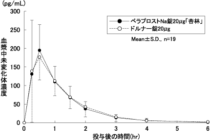 ベラプロストNa錠20μg「杏林」とドルナー錠20μgを、クロスオーバー法によりそれぞれ1錠(ベラプロストナトリウムとして20μg)健康成人男子に絶食単回経口投与して血漿中未変化体濃度を測定し、得られた薬物動態パラメータ(AUC、Cmax)について90%信頼区間法にて統計解析を行った結果、log(0.80)~log(1.25)の範囲内であり、両剤の生物学的同等性が確認された5) 。