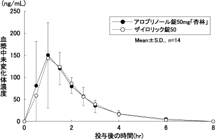 アロプリノール錠50mg「杏林」とザイロリック錠50をクロスオーバー法によりそれぞれ1錠(アロプリノールとして50mg)健康成人男子に絶食単回経口投与して血漿中未変化体濃度を測定し、得られた薬物動態パラメータ(AUC、Cmax)について90%信頼区間法にて統計解析を行った結果、log(0.80)~log(1.25)の範囲内であり、両剤の生物学的同等性が確認された7)。