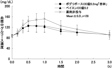 ボグリボースOD錠0.2mg「杏林」とベイスンOD錠0.2を、それぞれ3錠(ボグリボースとして0.6mg)健康成人男子(水なし20名、水あり28名)に絶食単回経口投与し、無投与群を含む3群に対し、ショ糖負荷(100g)における血漿中グルコース濃度を経時的に測定した。得られたパラメータ(AUC、ΔCmax)について90%信頼区間法にて統計解析を行った結果、log(0.80)~ log(1.25)の範囲内であり、両剤の生物学的同等性が確認された32)。