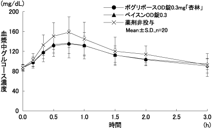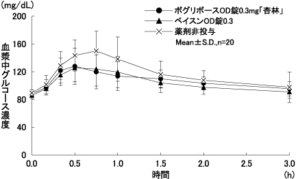 ボグリボースOD錠0.3mg「杏林」とベイスンOD錠0.3を、それぞれ2錠(ボグリボースとして0.6mg)健康成人男子(水なし20名、水あり20名)に絶食単回経口投与し、無投与群を含む3群に対し、ショ糖負荷(100g)における血漿中グルコース濃度を経時的に測定した。得られたパラメータ(AUC、ΔCmax)について90%信頼区間法にて統計解析を行った結果、log(0.80)~ log(1.25)の範囲内であり、両剤の生物学的同等性が確認された32)。
