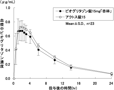 ピオグリタゾン錠15mg「杏林」とアクトス錠15をクロスオーバー法によりそれぞれ1錠(ピオグリタゾンとして15mg)健康成人男子に絶食単回経口投与して血漿中未変化体濃度を測定し、得られた薬物動態パラメータ(AUC、Cmax)について90%信頼区間法にて統計解析を行った結果、log(0.80)~log(1.25)の範囲内であり、両剤の生物学的同等性が確認された9)。