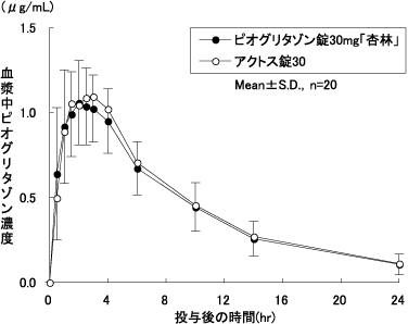 ピオグリタゾン錠30mg「杏林」とアクトス錠30をクロスオーバー法によりそれぞれ1錠(ピオグリタゾンとして30mg)健康成人男子に絶食単回経口投与して血漿中未変化体濃度を測定し、得られた薬物動態パラメータ(AUC、Cmax)について90%信頼区間法にて統計解析を行った結果、log(0.80)~log(1.25)の範囲内であり、両剤の生物学的同等性が確認された9)。