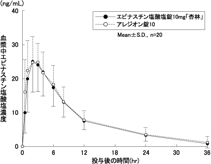 エピナスチン塩酸塩錠10mg「杏林」とアレジオン錠10をクロスオーバー法によりそれぞれ2錠(エピナスチン塩酸塩として20mg)健康成人男子に絶食単回経口投与して血漿中未変化体濃度を測定し、得られた薬物動態パラメータ(AUC、Cmax)について90%信頼区間法にて統計解析を行った結果、log(0.80)~log(1.25)の範囲内であり、両剤の生物学的同等性が確認された2)。