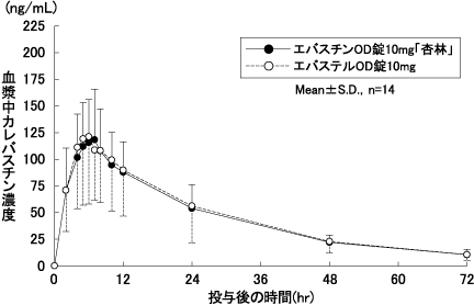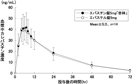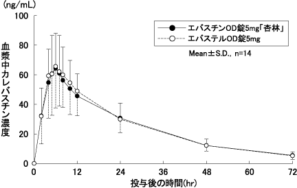 エバスチンOD錠5mg「杏林」とエバステルOD錠5mgを、クロスオーバー法によりそれぞれ1錠(エバスチンとして5mg)健康成人男子に絶食時単回経口投与(水なしで服用及び水で服用)して血漿中カレバスチン(エバスチンの代謝物)濃度を測定し、得られた薬物動態パラメータ(AUC、Cmax)について90%信頼区間法にて統計解析を行った結果、log(0.80)~log(1.25)の範囲内であり、両剤の生物学的同等性が確認された3)。