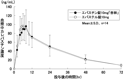 エバスチン錠10mg「杏林」とエバステル錠10mgを、クロスオーバー法によりそれぞれ1錠(エバスチンとして10mg)健康成人男子に絶食時単回経口投与して血漿中カレバスチン(エバスチンの代謝物)濃度を測定し、得られた薬物動態パラメータ(AUC、Cmax)について90%信頼区間法にて統計解析を行った結果、log(0.80)~log(1.25)の範囲内であり、両剤の生物学的同等性が確認された2)。