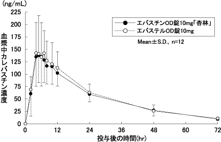 2) キョーリンリメディオ株式会社社内資料:エバスチン錠5mg・10mg「杏林」の生物学的同等性試験に関する資料