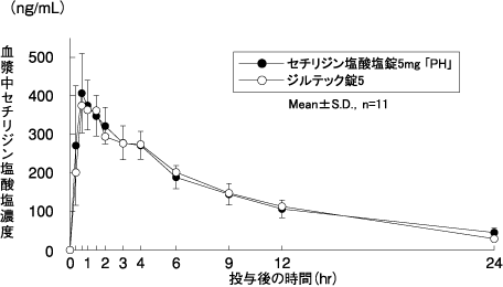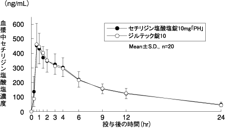 セチリジン塩酸塩錠5mg「PH」及びセチリジン塩酸塩錠10mg「PH」とジルテック錠5及びジルテック錠10を、クロスオーバー法によりそれぞれセチリジン塩酸塩として10mg健康成人男子に絶食単回経口投与して血漿中未変化体濃度を測定し、得られた薬物動態パラメータ(AUC、Cmax)について90%信頼区間法にて統計解析を行った結果、log(0.8)~log(1.25)の範囲内であり、両剤の生物学的同等性が確認された3)。