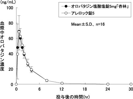 オロパタジン塩酸塩錠5mg「杏林」とアレロック錠5をクロスオーバー法によりそれぞれ1錠(オロパタジン塩酸塩として5mg)健康成人男子に絶食単回経口投与して血漿中未変化体濃度を測定し、得られた薬物動態パラメータ(AUC、Cmax)について90%信頼区間法にて統計解析を行った結果、log(0.80)~log(1.25)の範囲内であり、両剤の生物学的同等性が確認された3)。