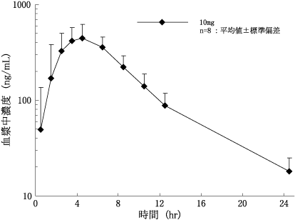 健康成人8例にモンテルカストフィルムコーティング錠10mgを空腹時に単回経口投与したとき、モンテルカストの血漿中濃度は投与3.9時間後に最高値(Cmax)526ng/mLに達し、消失半減期(t1/2)4.6時間で消失した(図16-1)。Cmax及び血漿中濃度―時間曲線下面積(AUC0-∞)は2~50mg注2)の範囲で投与量に比例して増大した(表16-1)4)。