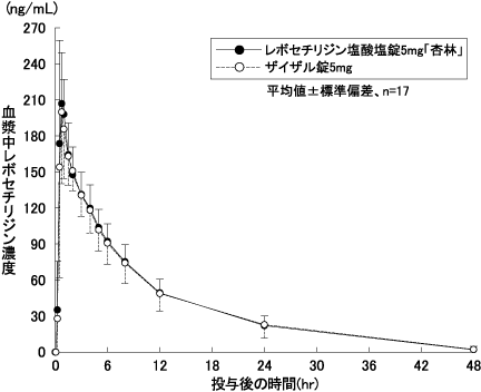 レボセチリジン塩酸塩錠5mg「杏林」とザイザル錠5mgをクロスオーバー法によりそれぞれ1錠(レボセチリジン塩酸塩として5mg)健康成人男子に絶食単回経口投与して血漿中未変化体濃度を測定し、得られた薬物動態パラメータ(AUC、Cmax)について90%信頼区間法にて統計解析を行った結果、log(0.80)~log(1.25)の範囲内であり、両剤の生物学的同等性が確認された4)。