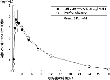 レボフロキサシン錠500mg「杏林」とクラビット錠500mgをクロスオーバー法によりそれぞれ1錠(レボフロキサシンとして500mg)健康成人男子に絶食単回経口投与して血漿中レボフロキサシン濃度を測定し、得られた薬物動態パラメータ(AUC、Cmax)について90%信頼区間法にて統計解析を行った結果、log(0.80)~log(1.25)の範囲内であり、両剤の生物学的同等性が確認された6)。