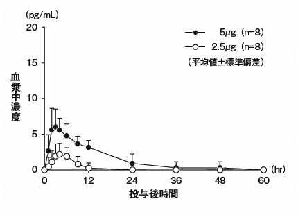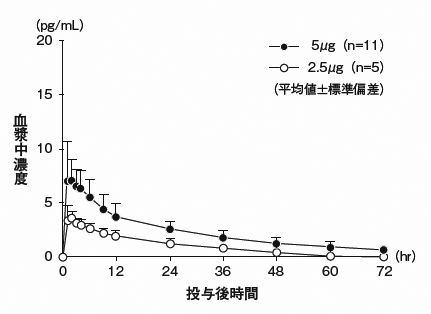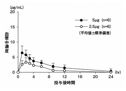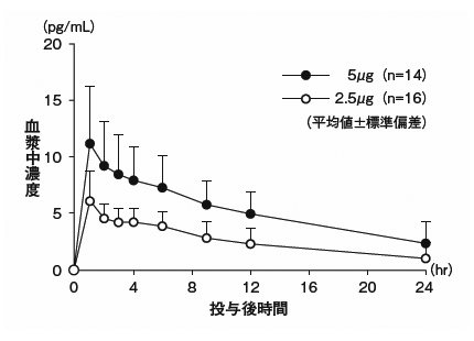 副作用発現率は、2.5μg群で60.0%(63/105例)、5μg群で54.1%(59/109例)であった。主な副作用は、2.5μg群でプロラクチン上昇13.3%(14/105例)、抗利尿ホルモン上昇及び総胆汁酸上昇7.6%(8/105例)、不眠及び甲状腺刺激ホルモン上昇6.7%(7/105例)、頻尿・夜間頻尿及び眠気5.7%(6/105例)、5μg群で、頻尿・夜間頻尿、便秘、眠気、プロラクチン上昇及び抗利尿ホルモン上昇7.3%(8/109例)、浮動性めまい5.5%(6/109例)であった。