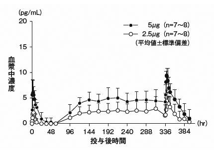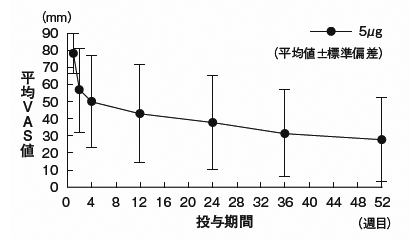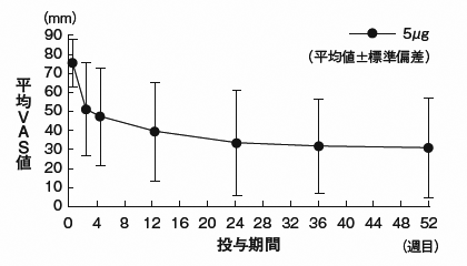 抗ヒスタミン薬又は抗アレルギー薬による治療が奏効しない難治性のそう痒症を有する慢性肝疾患患者注7) 316例を対象に、1日1回、12週間経口反復投与した際の有効性を、かゆみの指標であるVASを用い、多施設二重盲検比較試験により検討した。主要評価項目は、投与期間4週目(LOCF)のVAS変化量とした。その結果、投与前後でのVAS変化量において、2.5μg及び5μg投与群で有効性が確認された18) 。