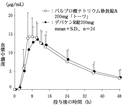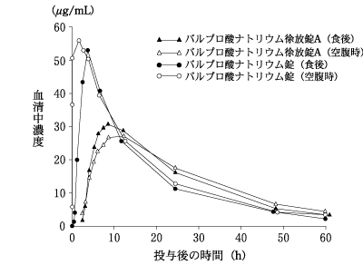 健康成人8例にバルプロ酸ナトリウム徐放錠A600mg(徐放錠200mgを1回3錠)及びバルプロ酸ナトリウム錠600mg(普通錠200mgを1回3錠)をそれぞれ単回経口投与したときの血清中バルプロ酸濃度の推移及び薬物動態パラメータは以下のとおりであった。普通錠と比較してバルプロ酸ナトリウム徐放錠Aでは制御された溶出に由来する血中濃度の安定した持続性(服薬後6、12及び24時間のそれぞれの濃度は食後投与群:28.0、28.8及び16.3μg/mL、空腹時投与群:22.9、27.4及び16.8μg/mL)が認められた。10),11)
