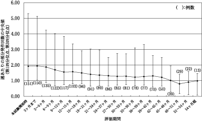 国内第Ⅱ/Ⅲ相試験(成人、併用療法)を完了した患者151例を対象として、レベチラセタム1000~3000mg/日を1日2回に分けて経口投与したときの部分発作回数は以下のとおりであった。本試験に参加した被験者のうち、76例がその後計画された継続試験に移行し本試験を終了した(24~36ヵ月で1例、36~48ヵ月で47例、48ヵ月以降で28例)。