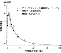 アセトアミノフェン細粒20%「トーワ」とカロナール細粒20%を、クロスオーバー法によりそれぞれ1.5g(アセトアミノフェンとして300mg)健康成人男子に絶食単回経口投与して血漿中未変化体濃度を測定し、得られた薬物動態パラメータ(AUC、Cmax)について統計解析を行った結果、両剤の生物学的同等性が確認された。2)