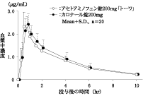 アセトアミノフェン錠200mg「トーワ」とカロナール錠200を、クロスオーバー法によりそれぞれ1錠(アセトアミノフェンとして200mg)健康成人男子に絶食単回経口投与して血漿中未変化体濃度を測定し、得られた薬物動態パラメータ(AUC、Cmax)について90%信頼区間法にて統計解析を行った結果、log(0.80)~log(1.25)の範囲内であり、両剤の生物学的同等性が確認された。2)