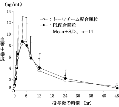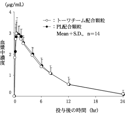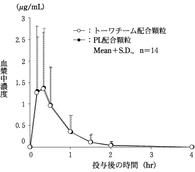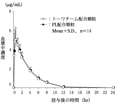 トーワチーム配合顆粒とPL配合顆粒を、クロスオーバー法によりそれぞれ2g(サリチルアミドとして540mg、アセトアミノフェンとして300mg、無水カフェインとして120mg及びプロメタジンメチレンジサリチル酸塩として27mg)健康成人男子に絶食単回経口投与してそれぞれの血漿中未変化体濃度を測定し、得られた薬物動態パラメータ(AUC、Cmax)について統計解析を行った結果、両剤の生物学的同等性が確認された。7)