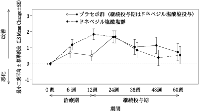 本試験では、認知機能障害、精神症状・行動障害の両症状に対するドネペジル塩酸塩の有効性がプラセボに比較して優れているという検証仮説は検証されていない。18)