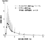 ラメルテオン錠8mg「トーワ」とロゼレム錠8mgを、クロスオーバー法によりそれぞれ1錠(ラメルテオンとして8mg)健康成人男子に絶食単回経口投与して血漿中未変化体及び主代謝物M-Ⅱ濃度を測定し、得られた薬物動態パラメータ(AUC、Cmax)について90%信頼区間法にて統計解析を行った結果、いずれもlog(0.80)~log(1.25)の範囲内であり、両剤の生物学的同等性が確認された。3)